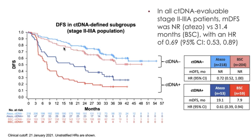 Heather Wakelee教授还特别介绍了上海市肺科医院周彩存教授在2021年欧洲免疫肿瘤学大会(ESMO IO)上展示的IMpower010研究亚组分析,这是一项研究循环肿瘤DNA(ctDNA)的探索性研究。理论上说,ctDNA阳性的患者癌症复发风险更高。而该分析表明,ctDNA阳性患者——即复发风险更高的早期NSCLC患者接受阿替利珠单抗似乎获益显著。该分析也提示,ctDNA检测或将对早期肺癌患者的辅助治疗具有越来越重要的价值。