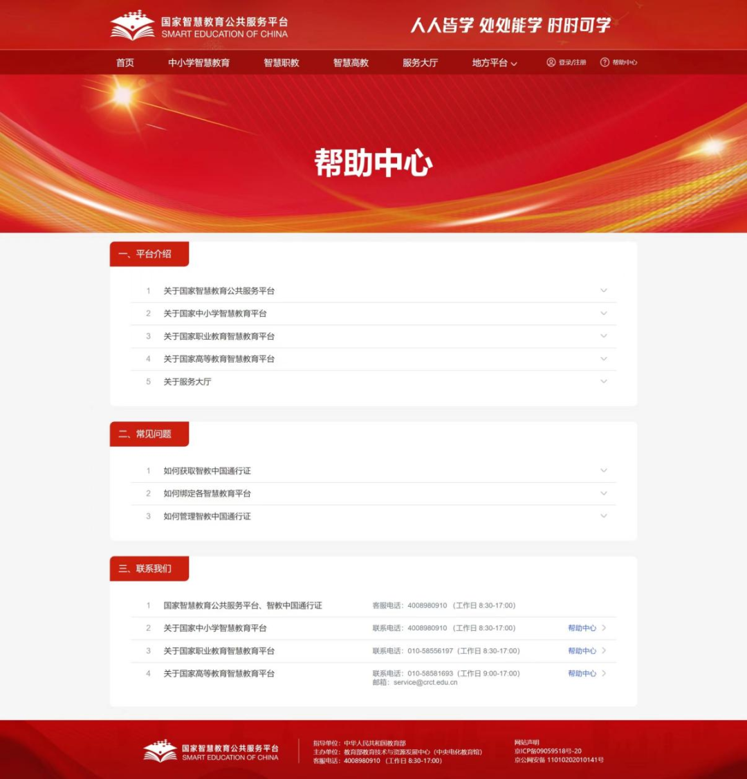 同步上线“帮助中心”,设置平台介绍、常见问题和联系我们等3个栏目,帮助师生便捷使用国家智慧教育平台。