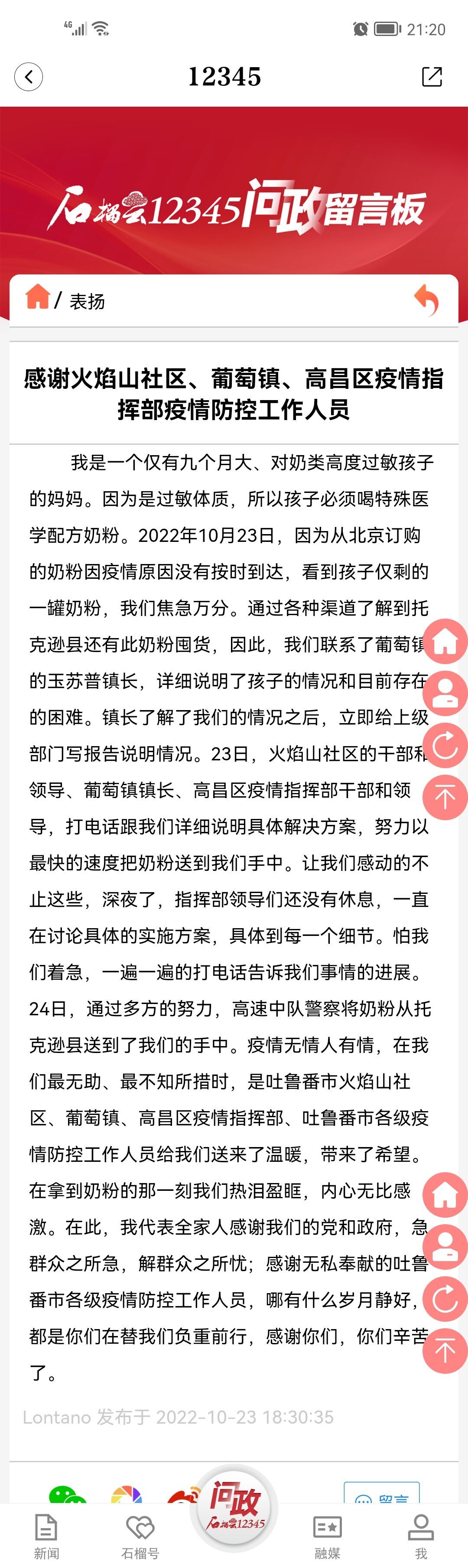 奶粉有了,可怎么送到父母家?莎热汗向吐鲁番市高昌区葡萄镇火焰山社区求助,希望能由她爱人驾车去托克逊县取奶粉,再送到鄯善县。10月22日,接到莎热汗的诉求,火焰山社区经过研判,初步同意了她的请求,并向葡萄镇新冠肺炎疫情防控工作指挥部申请予以协调。