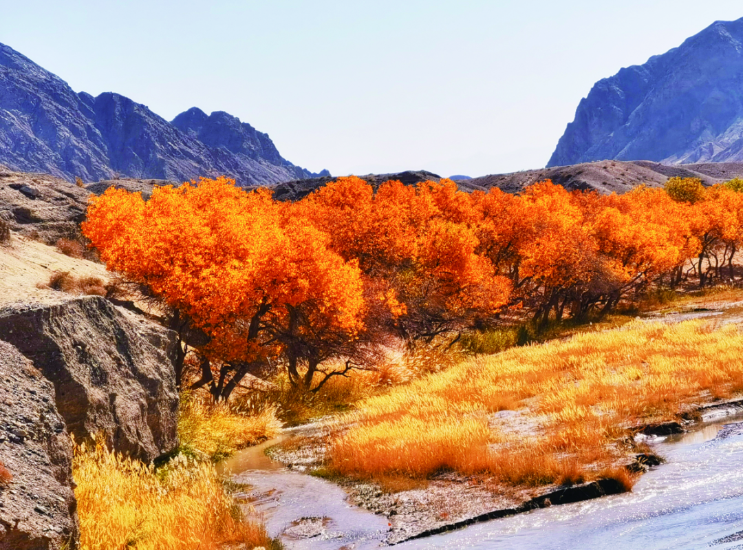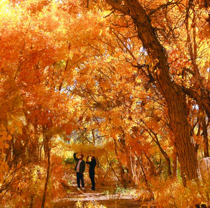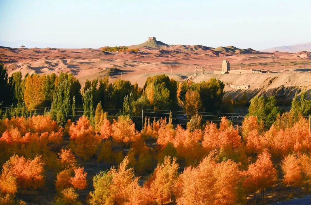 胡杨金波,黄沙烽燧,秋景瑰艳,霜色流丹。当酒泉大地被秋色尽染,长天一色,万里金黄,空气中弥漫的是丰收的味道和喜悦。秋天的酒泉经历了春夏的酝酿,迎来了最浓烈的表达。萧萧远树流林外,一半秋山带夕阳。登高望远,祁连不远,万木尽染胭脂红,大地皆披金色。