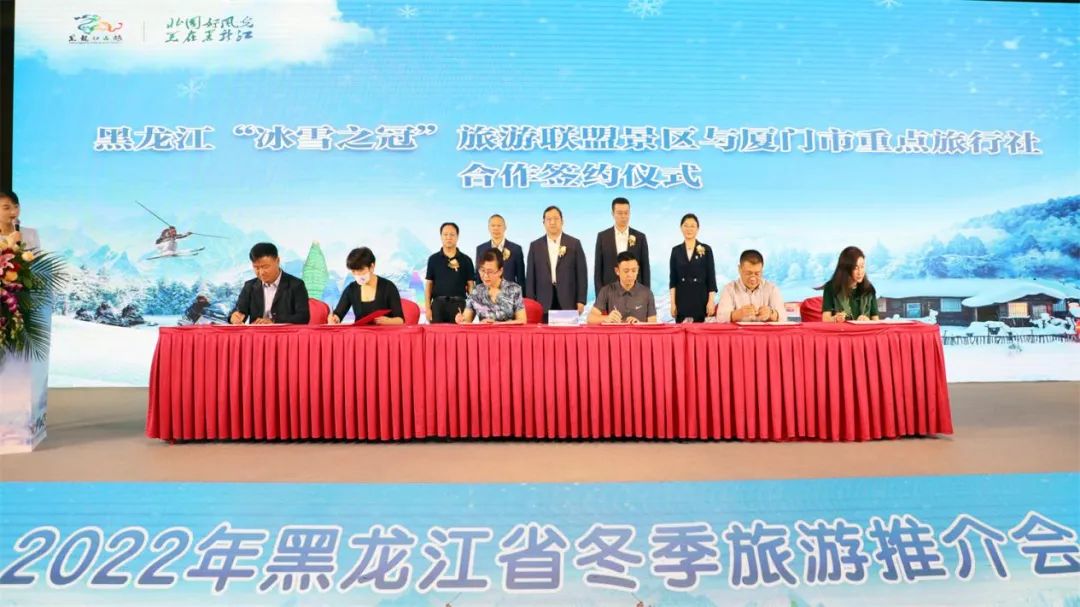 本次发布会由黑龙江省文化和旅游厅主办、携程集团承办。作为本次会议的一大亮点,黑龙江冰雪之冠旅游推广联盟景区与厦门市重点旅行社的合作签约仪式在现场举行,携手促进引客入龙江。