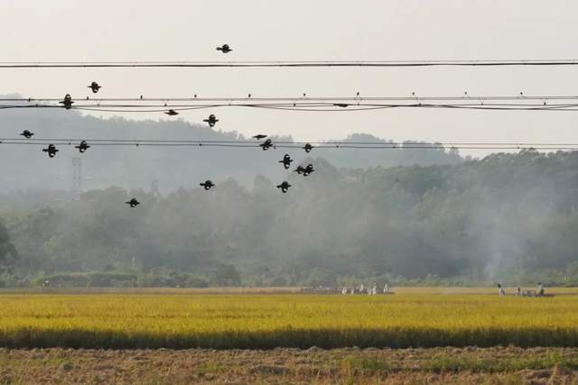 一群八哥鸟在稻田上空嬉戏