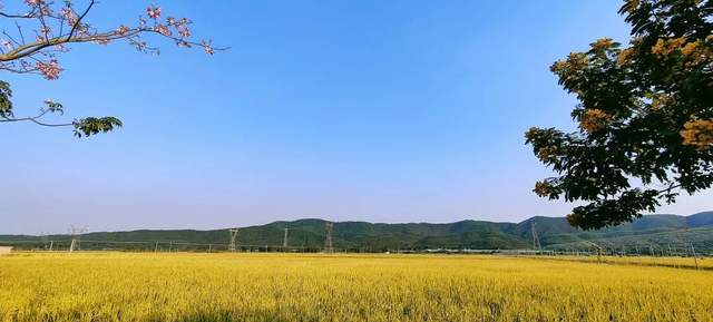 金黄色的稻田与粉红色的鲜嫩花瓣