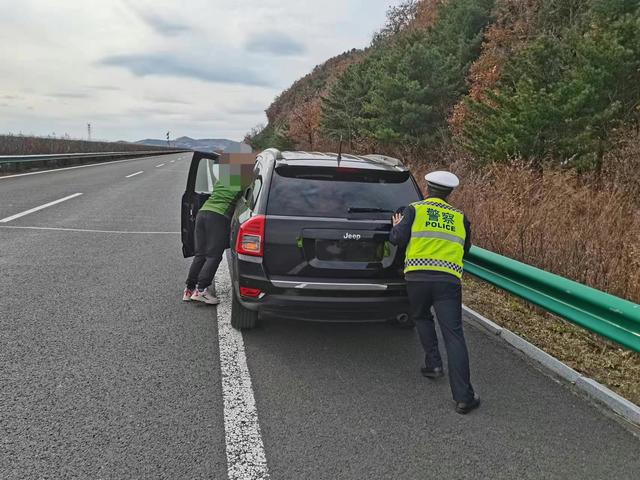 近日,敦化分局巡逻四大队民警沿鹤大高速公路巡逻时,发现一辆黑色小型越野车开着双闪停在行车道上,过往车辆纷纷减速避让,情况十分危险,民警立即停车上前了解情况。