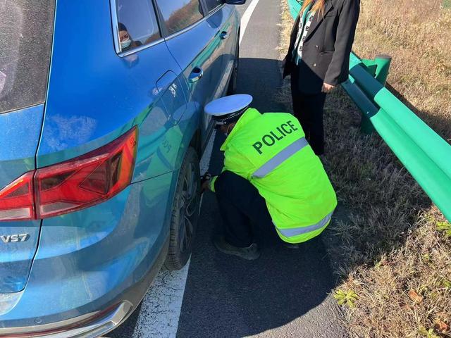 近日,敦化分局巡逻三大队民警巡逻至鹤大高速鹤岗方向583公里处时,发现一辆蓝色越野车停在应急车道内,一女子站在车旁边打电话边注视着轮胎,愁眉紧锁。见此情形,民警立即前去查看。经询问得知,李女士驱车从敦化市准备前往黑龙江省牡丹江市探亲,行至此处时,发现车身晃动不敢再继续前行。慌乱之际,李女士努力将车停在了应急车道内,第一次遇到这种情况,她心惊胆战,面目苍白,正不知所措之际遇到了民警。