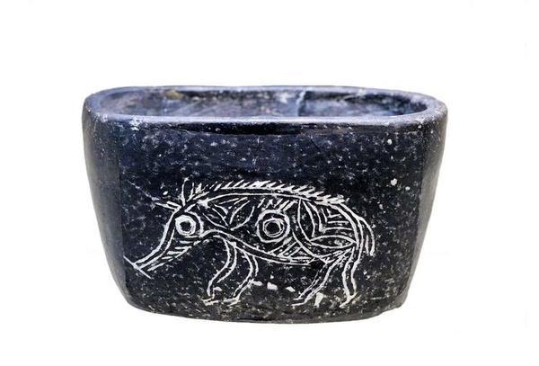 新石器时期河姆渡文化的猪纹陶钵,1973年余姚河姆渡遗址出土,整个器形呈长方形,四角弧圆,平底。夹炭黑陶制成。器高11.6厘米,长21.2厘米,宽17.2厘米,浙江省博物馆的馆藏珍品。