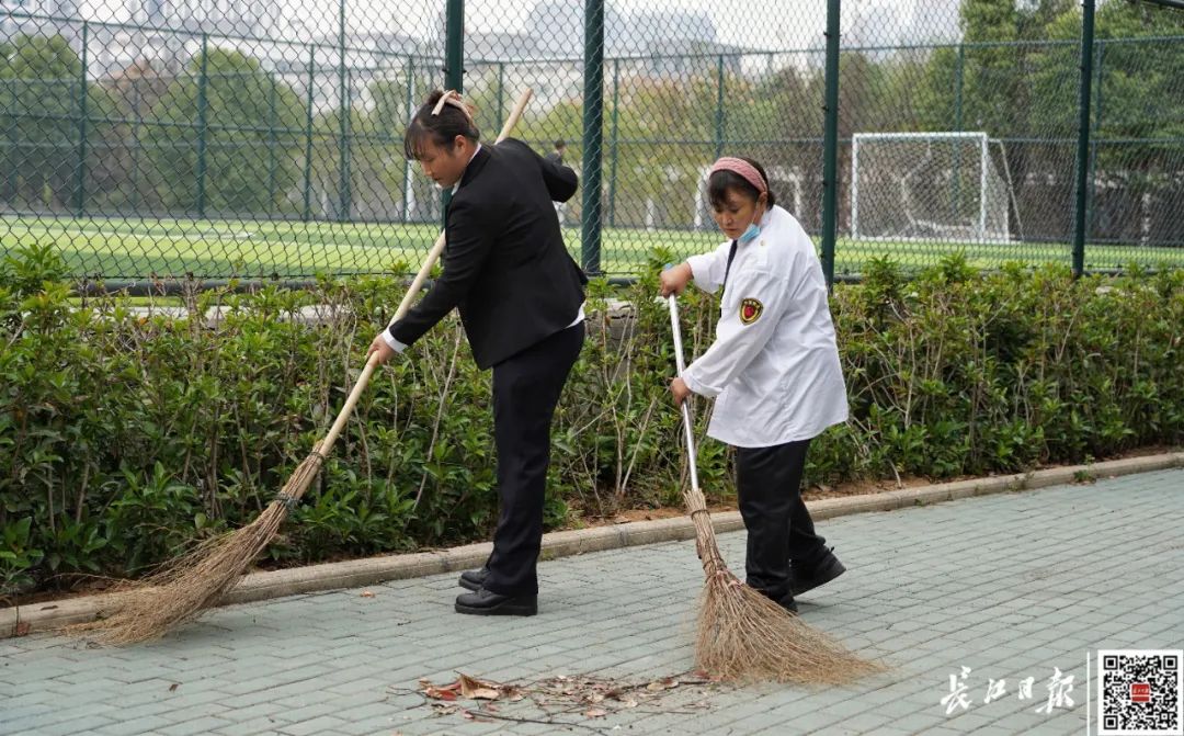 贾鑫每天都要帮着妈妈清扫宿舍门口的路面。记者肖僖 摄