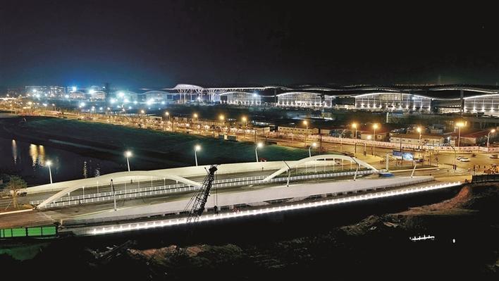 值得一提的是,展览大道特大景观桥(3号桥)是空港新城项目众多桥梁里最重要的一座,全长170米,全桥桥宽62米到68.89米,上部结构为钢纵横梁—钢箱拱组合体系。全桥钢材采用桥梁专用钢,合计1.1万吨,主要由桥面系、主拱肋及81根吊杆系统组成,为双向六车道钢结构景观桥,在国际会展中心整体布局上的位置极为重要,是连接国际会展中心与外界交通的大动脉,也是国际会展中心的形象门户,更是深圳国际会展中心重点打造的景观桥。