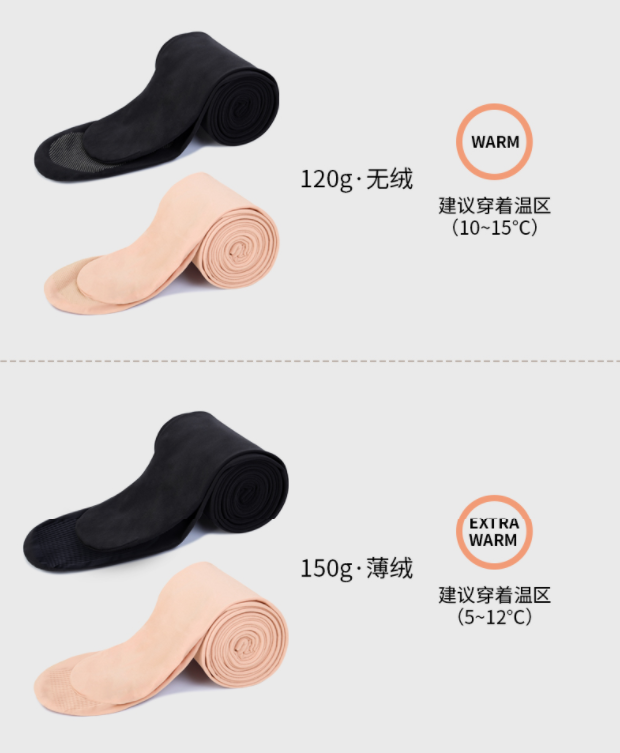 针对不同地区的温度,laseta打底袜特别设计了无绒(200D)和薄绒(400D) 2款不同厚度,无绒适合温度:10-15℃,薄绒适合温度:5-12℃。