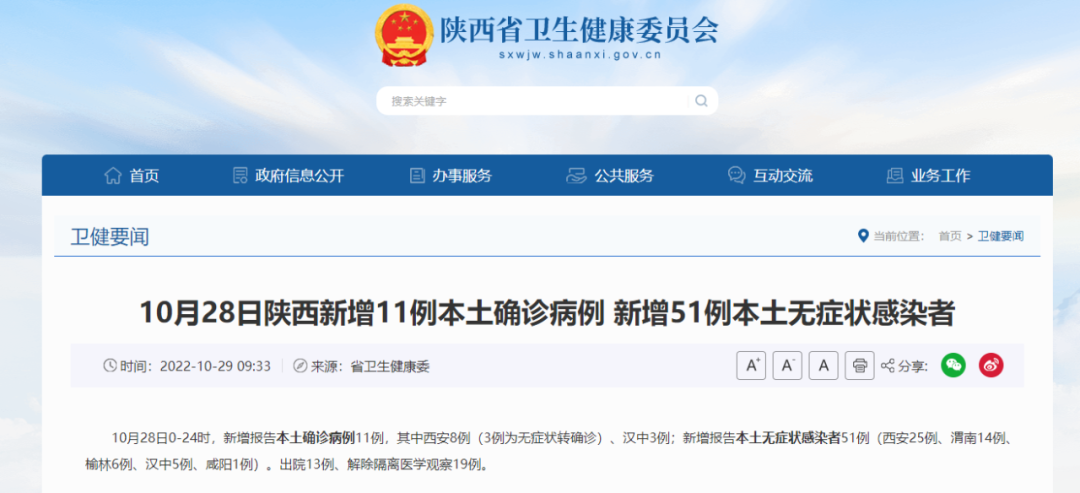 10月28日0-24时,新增报告本土确诊病例11例,其中西安8例(3例为无症状转确诊)、汉中3例;新增报告本土无症状感染者51例(西安25例、渭南14例、榆林6例、汉中5例、咸阳1例)。出院13例、解除隔离医学观察19例。
