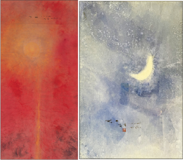 程及大师赠李亚新的画作;左:抽象的太阳;右:抽象的月亮