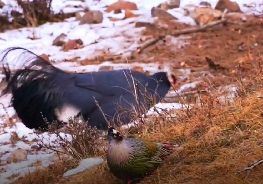 甘肃省肃南裕固族自治县群众近日在祁连山区偶遇珍稀动物血雉和蓝马鸡一同觅食,并用相机记录下来。