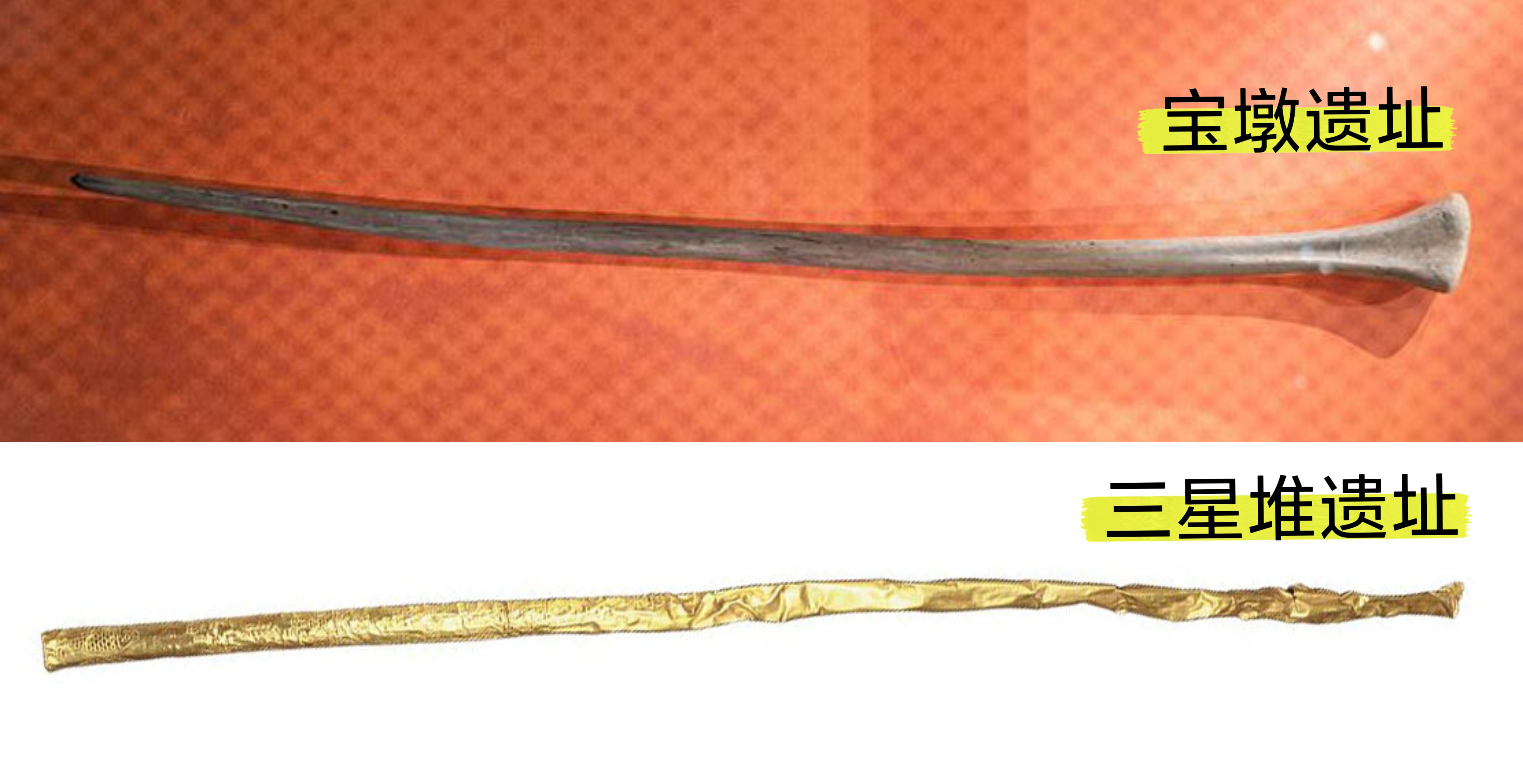 三星堆遗址1号坑中曾出土一件黄金包裹的木质杖体,“学术界一般将其认定为与三星堆神权、王权有关,代表权力、威仪和等级的‘权杖’或‘神杖’”。霍巍说。