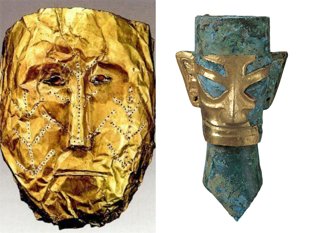 三星堆遗址曾出土一些附有黄金箔“金面具”的青铜头像,是三星堆文明中独具特色的面具艺术。