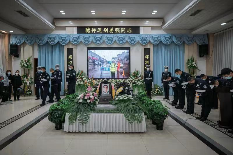 庄重的万年厅门里门外都是穿警服的战友,他们眼里滚着泪花,心中万千不舍。大屏幕上,姜强生前的工作照滚动播放。灵柩旁,父母早已哭成泪人。