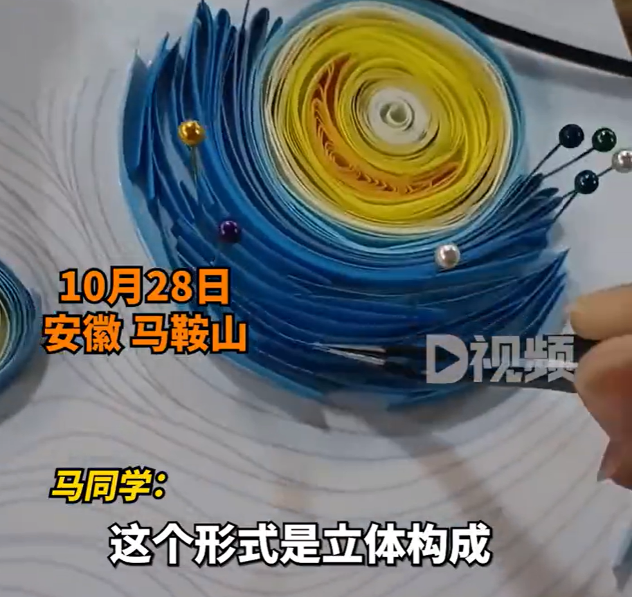 据西部决策报道,10月28日,安徽马鞍山正在读大二的马同学,用300余条纸带,以衍纸的方式,耗时5天做出了梵高的经典作品《星空》,令人惊艳。