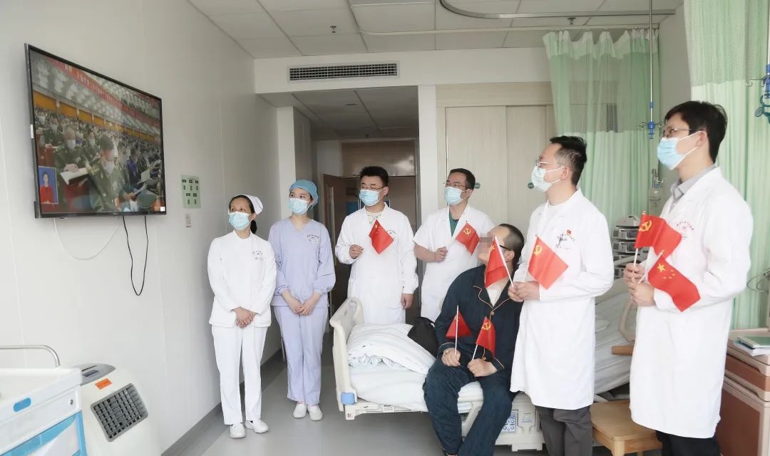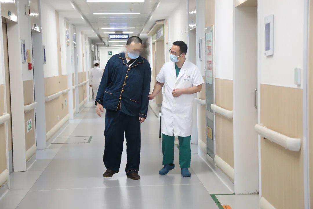 ▲心血管外科重症监护病区负责人汤浩副主任医师陪同患者做康复行走训练
