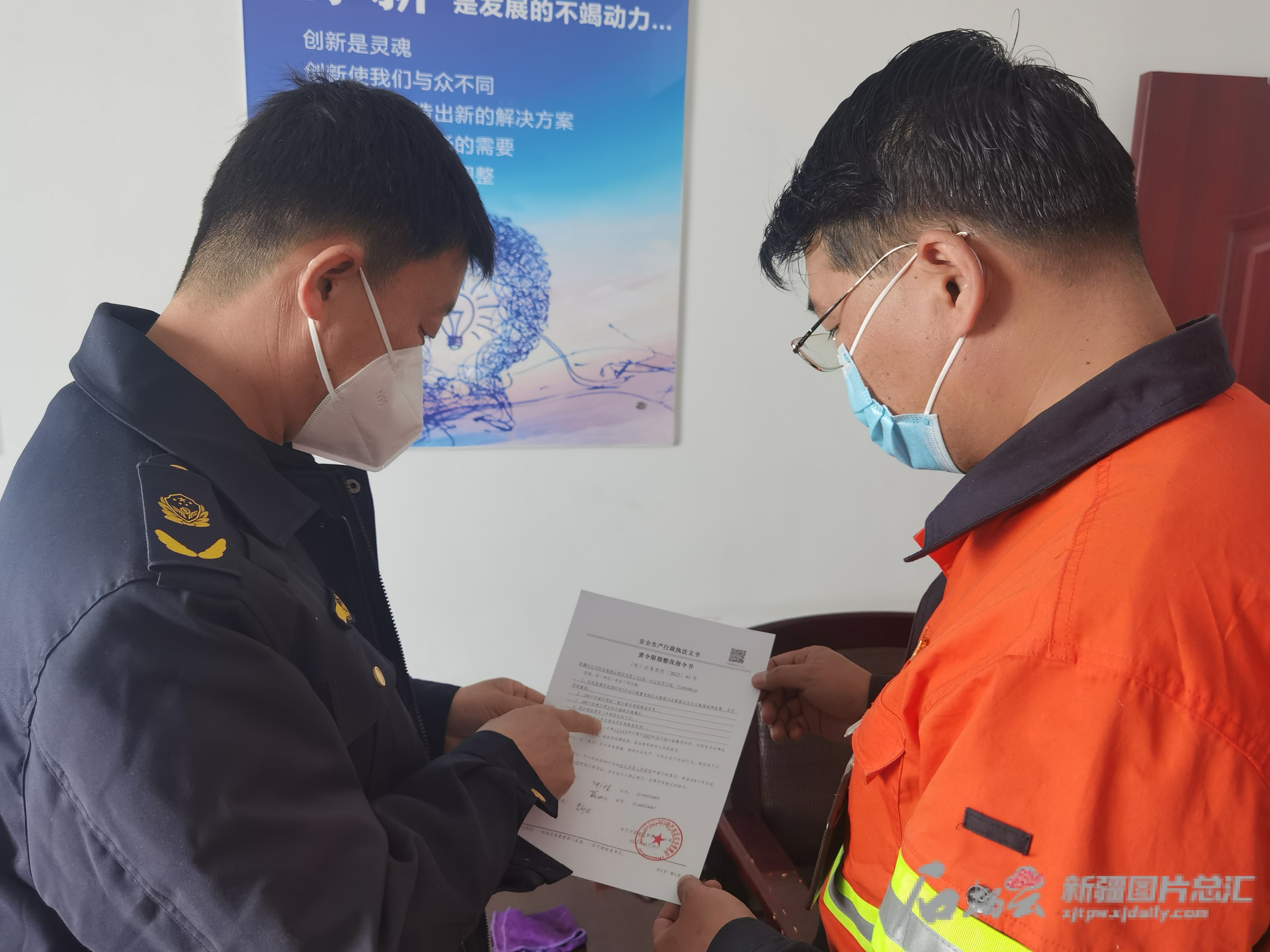 10月29日,哈巴河县应急管理局安全生产执法监督大队队长贺刚(左)正在为某矿业公司负责人宣读整改文书。图片由自治区应急管理厅提供