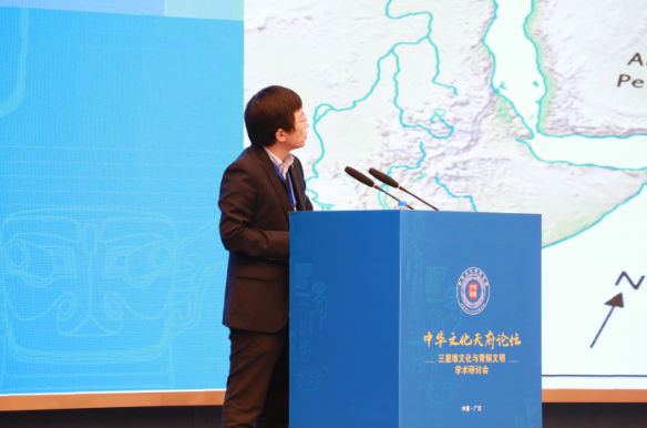 本次主旨演讲,王献华就站在亚欧大陆青铜时代的大背景下,以宏大的视野切入三星堆文明。“交通线”和“力量场”是王献华主旨演讲的关键词,王献华认为,作为半月形文化传播带上的重要一环,三星堆文明正处于当时中华文明塑形时期的重要节点,也处于地理交通线的大动脉上,因此形成了强大的力量场,影响了中华文明进程。