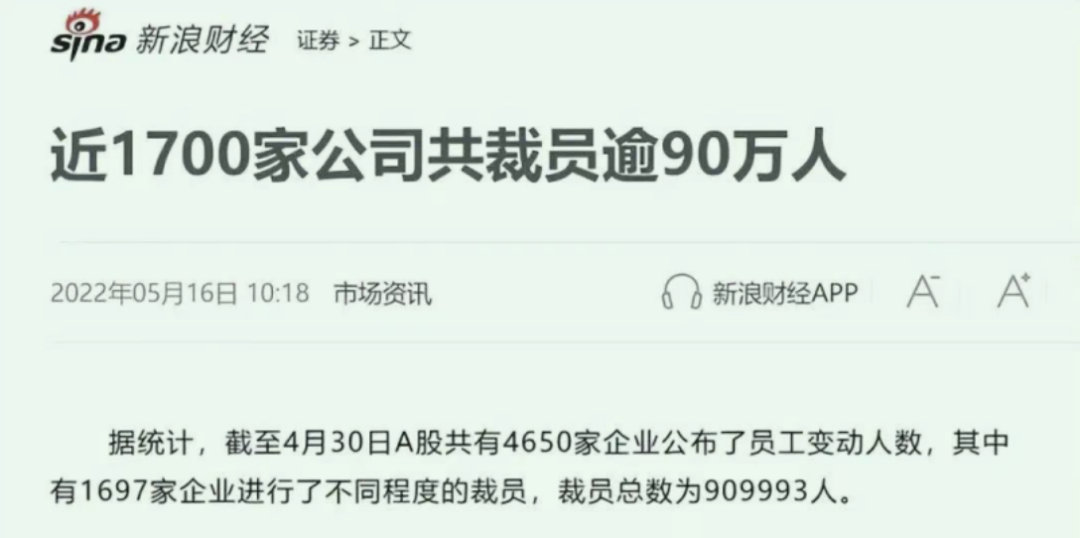 国内4650家A股上市公司中,有1697家企业裁员,裁员总人数超过90万人。