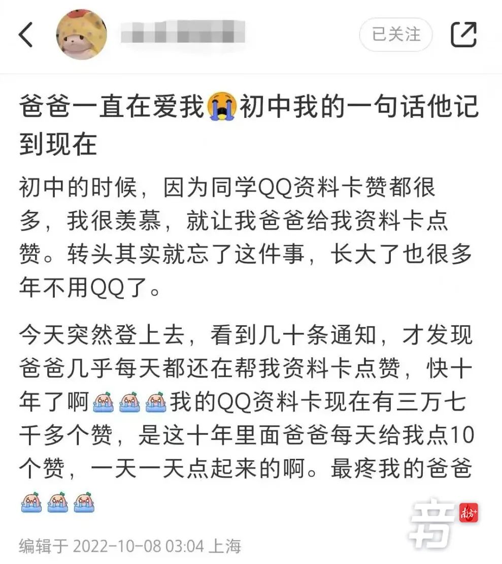 她在社交平台上分享时说:“最近,我登上QQ,看到许多消息记录,才发现爸爸几乎每天还在帮我点赞,快十年了啊,现在已经有37000多个赞了,一天一天点起来的啊!”