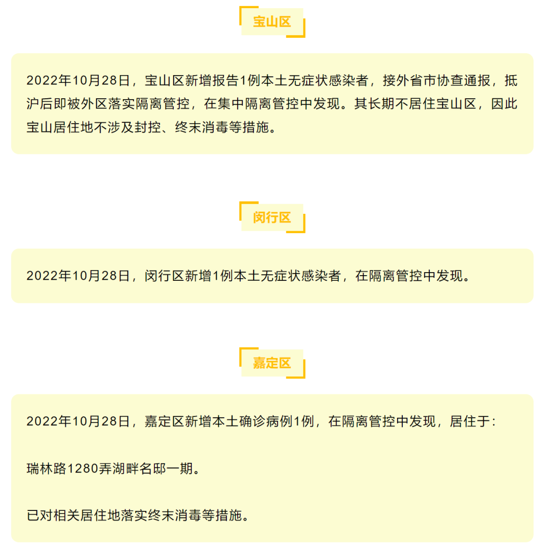 上海市卫健委今早(10月29日)通报:2022年10月28日0—24时,新增本土新冠肺炎确诊病例1例和无症状感染者8例,均在隔离管控中发现。新增境外输入性新冠肺炎确诊病例5例和无症状感染者35例。