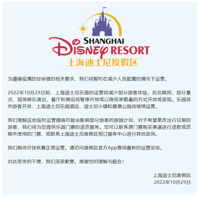 2022年10月29日起,上海迪士尼乐园的运营将减少部分游客体验。在此期间,部分景点、现场娱乐演出、餐厅和商店将暂停开放或以降低承载量的方式开放或呈现。乐园将向游客开放,上海迪士尼乐园酒店、迪士尼小镇和星愿公园将继续运营。