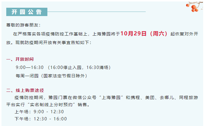 昨天下午,上海豫园官方微信公众号发布开园公告:在严格落实各项疫情防控工作基础上,上海豫园于10月29日(周六)起恢复对外开放。