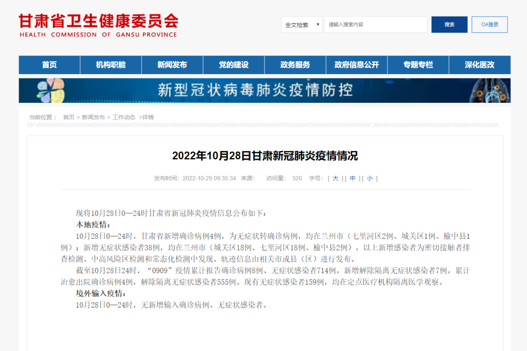 10月28日0—24时,甘肃省新增确诊病例4例,为无症状转确诊病例,均在兰州市(七里河区2例、城关区1例、榆中县1例);