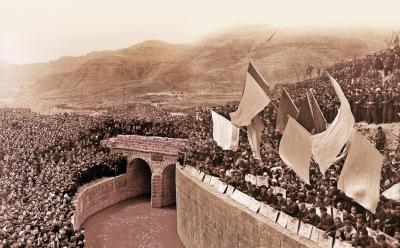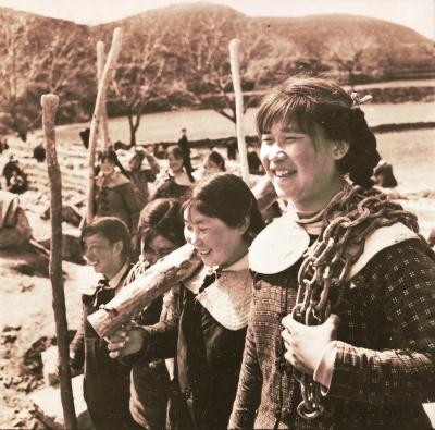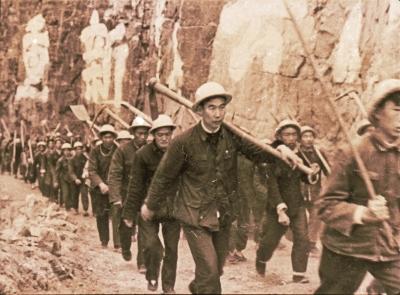 数以万计的人们肩扛手抬,把修渠用的水泥、石料源源不断地运往工地。