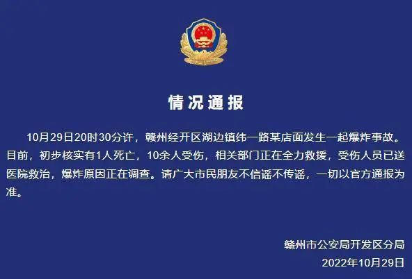 10月29日20时30分许,赣州经开区湖边镇纬一路某店面发生一起爆炸事故。目前,初步核实有1人死亡,10余人受伤,相关部门正在全力救援,受伤人员已送医院救治,爆炸原因正在调查。请广大市民朋友不信谣不传谣,一切以官方通报为准。