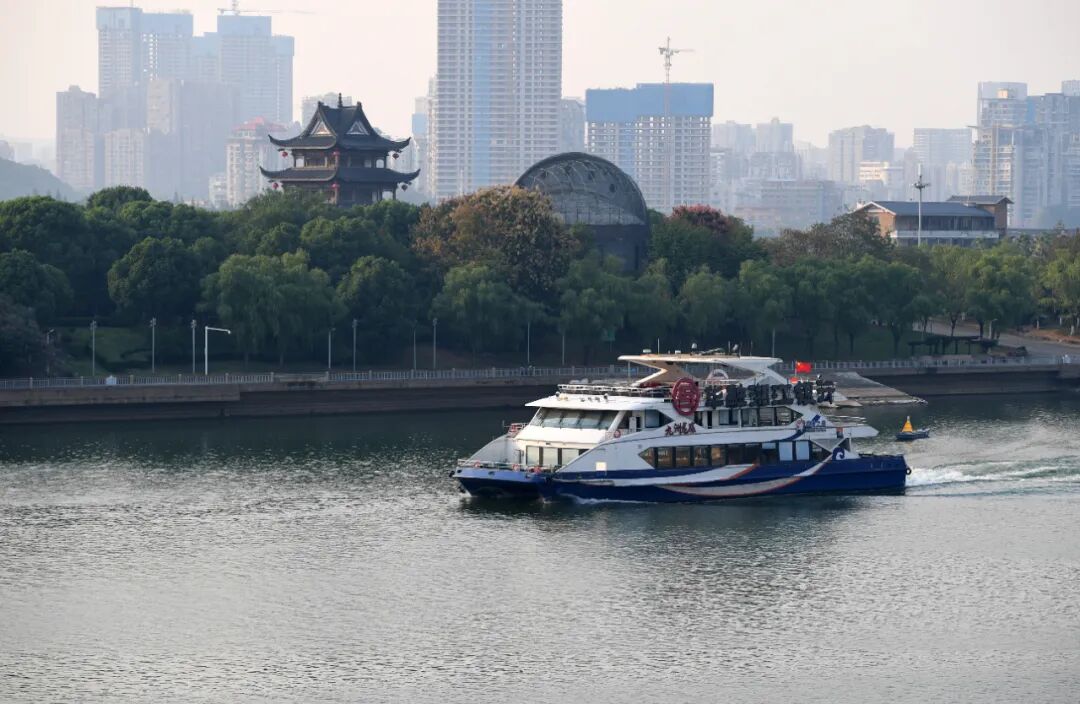 长沙市橘洲旅游码头航线入选城市景观游试点,这条航线的船舶为“九洲龙骧号”游船。