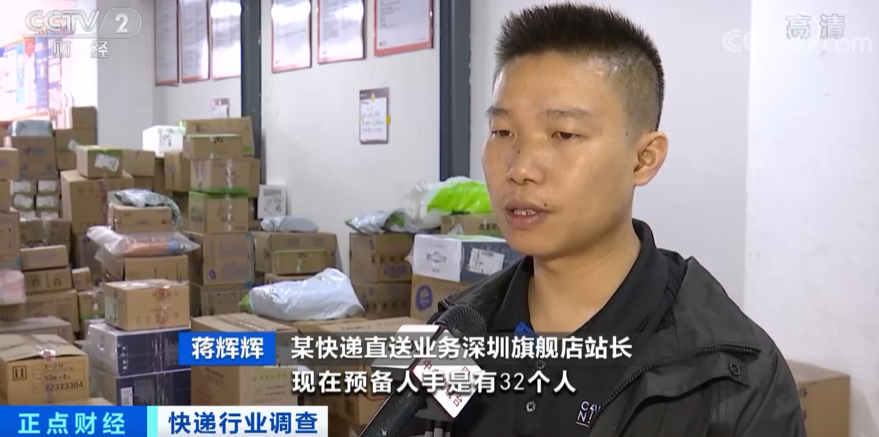 某快递直送业务深圳旗舰店站长 蒋辉辉:正常14个人就够了,现在预备人手是有32个人,通过亲戚朋友介绍,公司也有专门的招募人员,薪资还是挺高的,每天少的话有四五百元,多的话七八百元,目前看人手还需要增加。