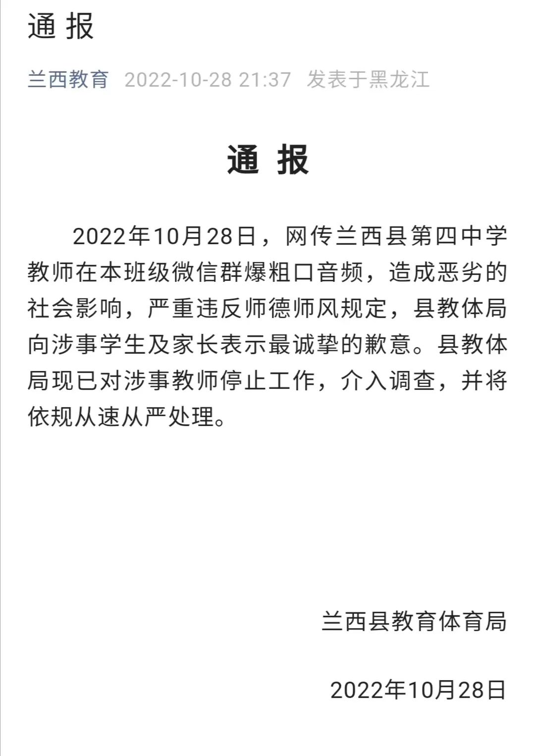 黑龙江省兰西县官方通报中学教师班级群内爆粗口:已停职,向涉事学生及家长致歉