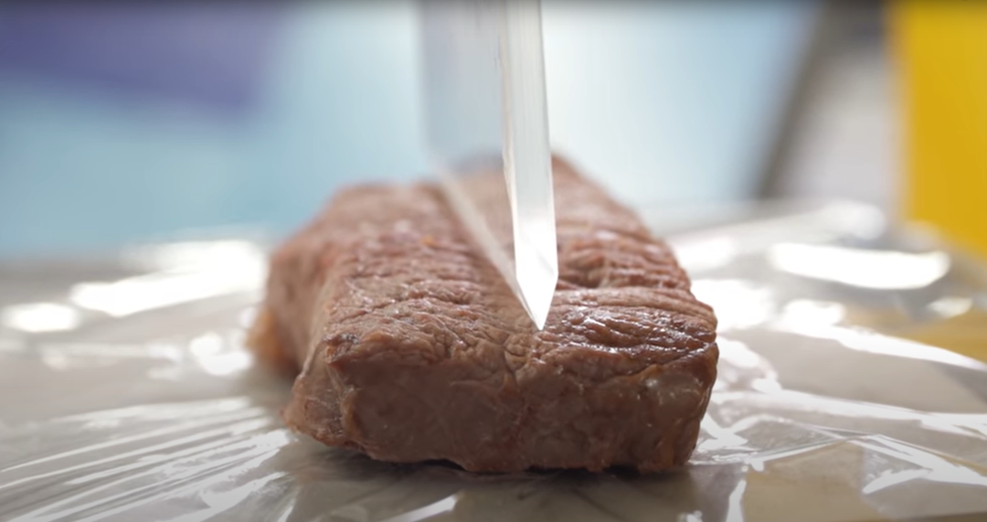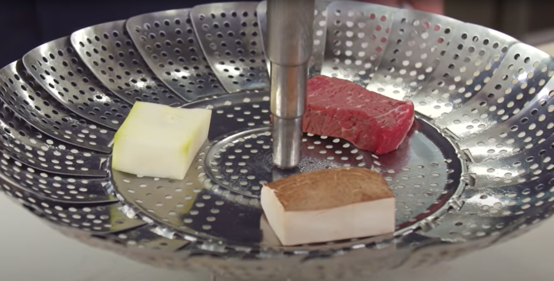 为了比较各类食材,苏扎切了一块牛里脊、一块褐菇和一块西葫芦,都约为1.3厘米厚,然后将它们放进蒸锅,蒸一段时间后再用CT3质构分析仪来测量它们的“耐咬程度“,也就是咬这些食材需要花多少力。