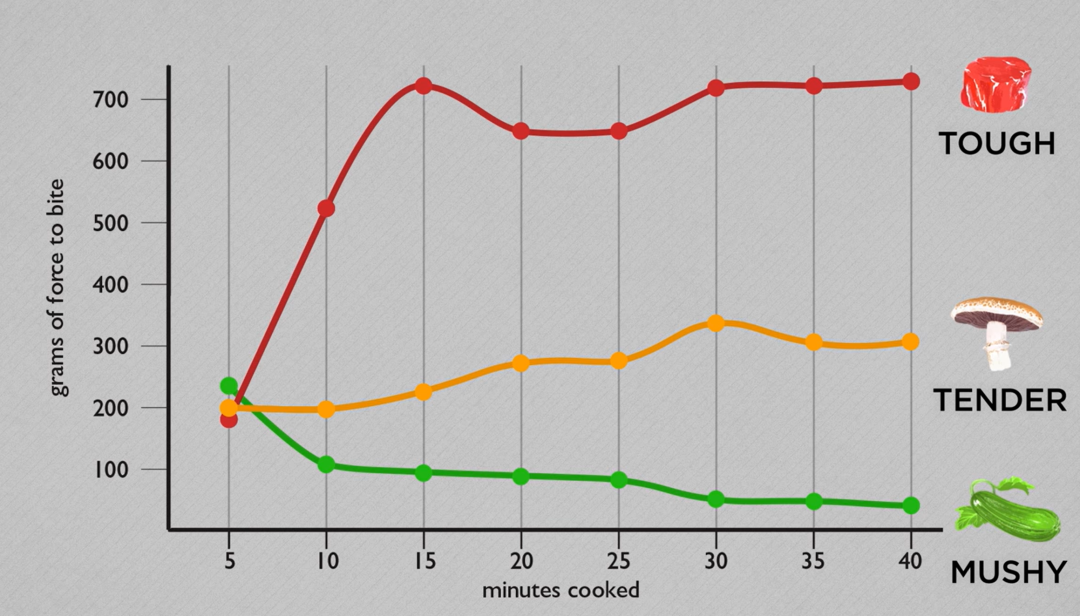 牛里脊、褐菇和西葫芦蒸了以后“耐咬程度”的变化 | America's Test Kitchen / YouTube