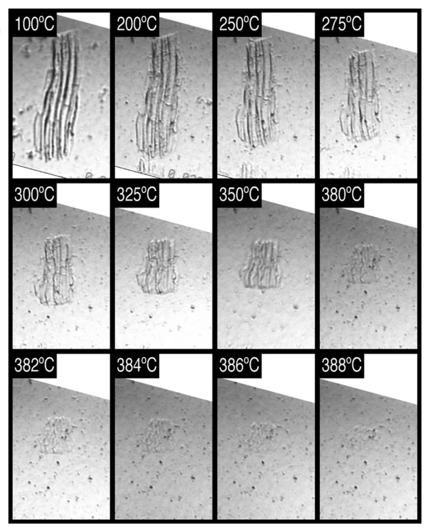 几丁质有很好的耐热性,在烹煮中几乎不会改变结构,因此蘑菇的口感也能够保持稳定。在一项研究里,科学家在25 MPa的恒定高压下,对金针菇进行加热,并用光学显微镜观察菌丝在不同温度下的形态。从室温加热到大约200°C时,菌丝基本保持不变;如果继续升温,长长的菌丝会急剧收缩,但它们的宽度没有变化;到了380°C-390°C,由于几丁质完全分解,菌丝才会最终溶解消失——一般我们做菜时的温度和压强,并不足以让蘑菇产生这么大的变化。