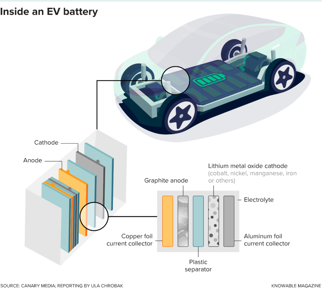 为了给汽车供电,电池中的电子从负极(即阳极)移动到正极(阴极)。通常情况下,阳极由铜和石墨制成,而阴极由一类称为锂金属氧化物的化合物组成,含有锂以及钴、锰和镍等其他金属。