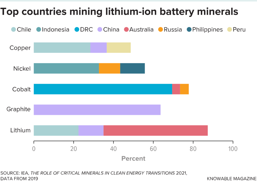 所有这些金属都必须提取出来,而且仅靠回收还不能满足市场需求。尽管美国有很多铜矿(并从废品回收中获得相当大一部分铜),但锂离子电池中几乎所有的其他金属都来自其他国家的矿区。全球80%以上的锂来自智利、澳大利亚和中国,而60%以上的钴来自刚果民主共和国。