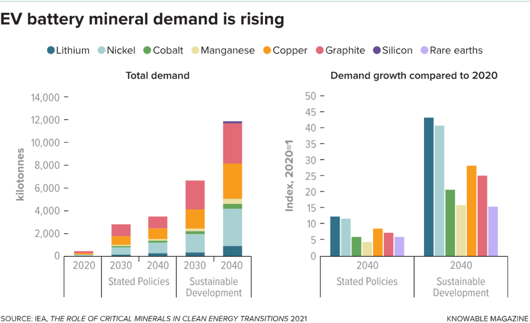 为了满足不断增长的电动车电池需求,美国政府和企业正在投资国内所需矿物的开采——包括镍、锰、钴和锂(其价格在2021年增长到四倍多)。他们同时也在寻找方法,通过回收利用来减少对新开采材料的依赖。2022年3月,美国总统乔·拜登援引《国防生产法》来增加高需求矿物的供应,引导国内对采矿和其他形式的回收进行投资。