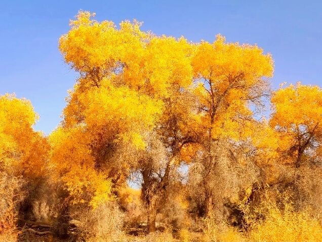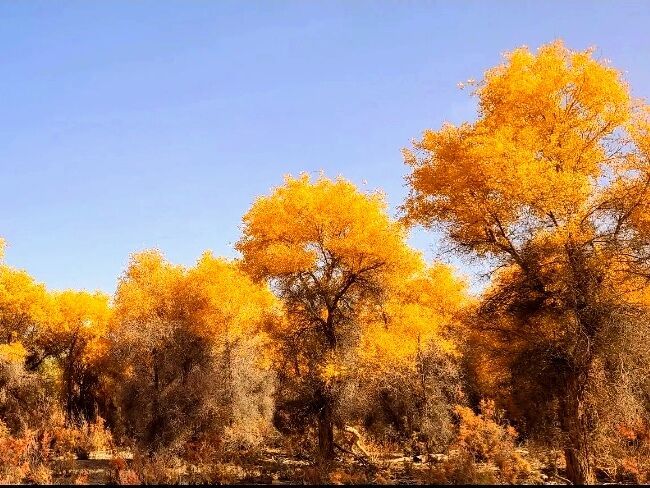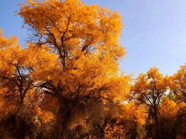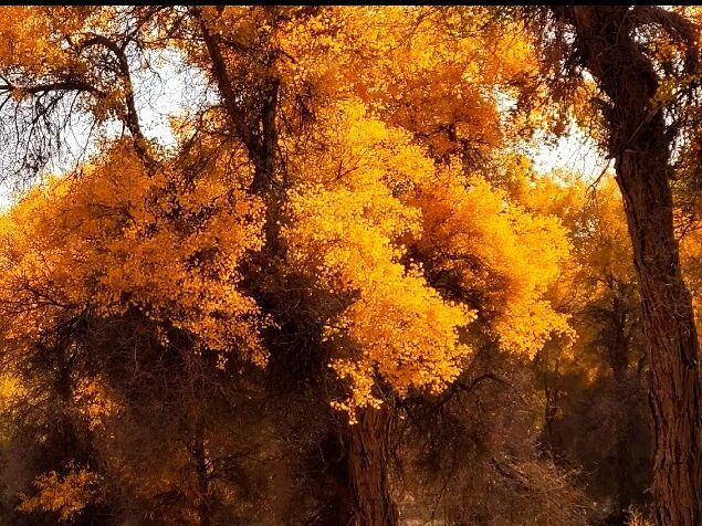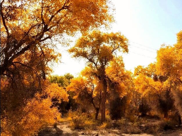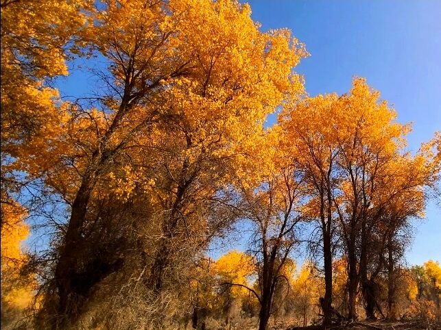 新疆沙雅胡杨林黄叶期一般为10月上旬至10月下旬,落叶一般为11月上中旬,目前正是最美观赏期哦。你可知道,胡杨林颜色叶片变化对温度具有极高的敏感性,随着天气逐渐变冷温度降低,慢慢地胡杨林树叶80%以上叶片会由金黄会变成金红,再变成褐红,伴随落叶,最后完美谢幕。 图/文:任景华