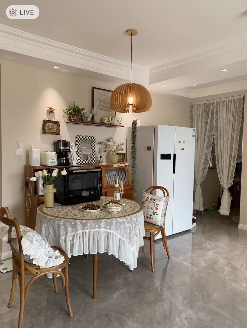 地砖和客厅通铺,放了一个餐边柜,还有实木圆桌,是女主最喜欢的小角落,保留了复古感觉。将冰箱摆放在餐厅,可以在很大程度上解放厨房,让小小的厨房不至于太拥挤。