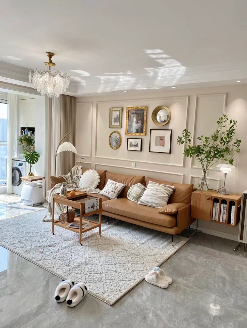 客厅主基调是暖色系,乳胶漆用的是奶咖色,沙发是棕色的2.8m,配的软装几乎都是同色系,射灯用的7w,4000k,显得整个客厅很温馨。