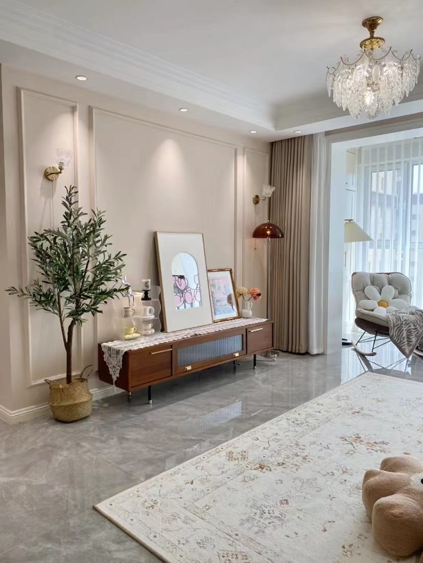 电视机背景墙:3米,大框2米,旁边小框40,间距10。没装电视,最近可能会买。开间大概3.5米。装了法式吊灯和一18个7w射灯,简单营造灯光氛围感。