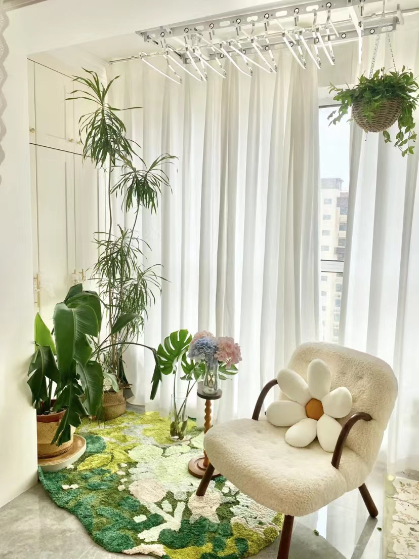 在阳台开辟了一个小角落,算是满足女主绿植花园的一个小梦,绿色的苔藓地毯一铺,加上本来就是绿色的窗帘,整个氛围感就上来了,但是目前还在打造中,再买些绿植就好。