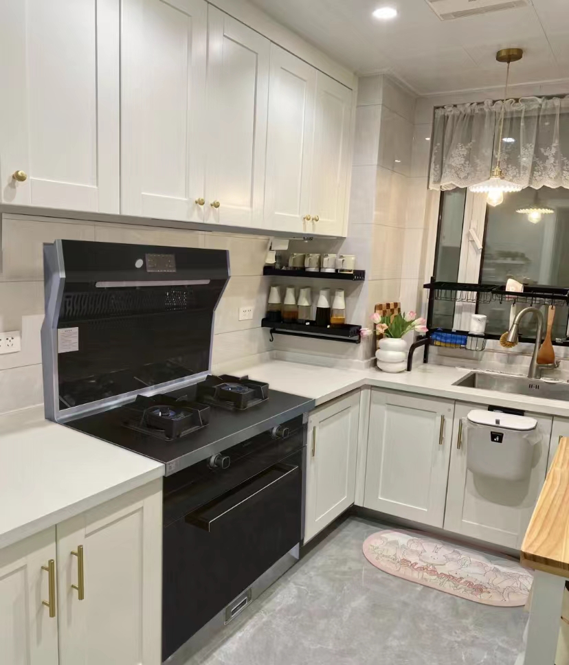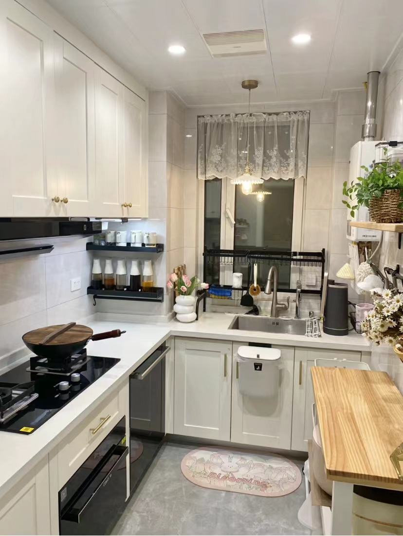 整体是“u”字形厨房,根据洗菜、备菜、煮菜、装盘的做饭顺序布局。另一侧放置物架收纳物品。吊柜是实木多层白色烤漆,真的很好打理,油渍一擦就掉。