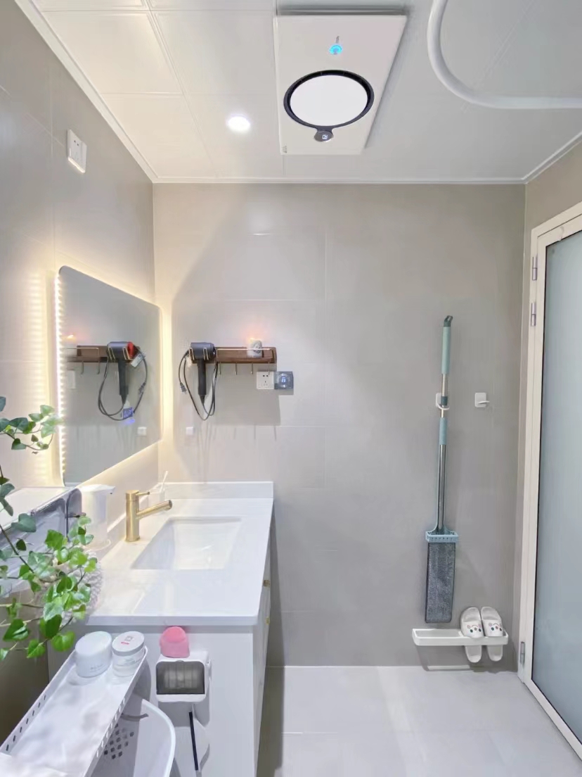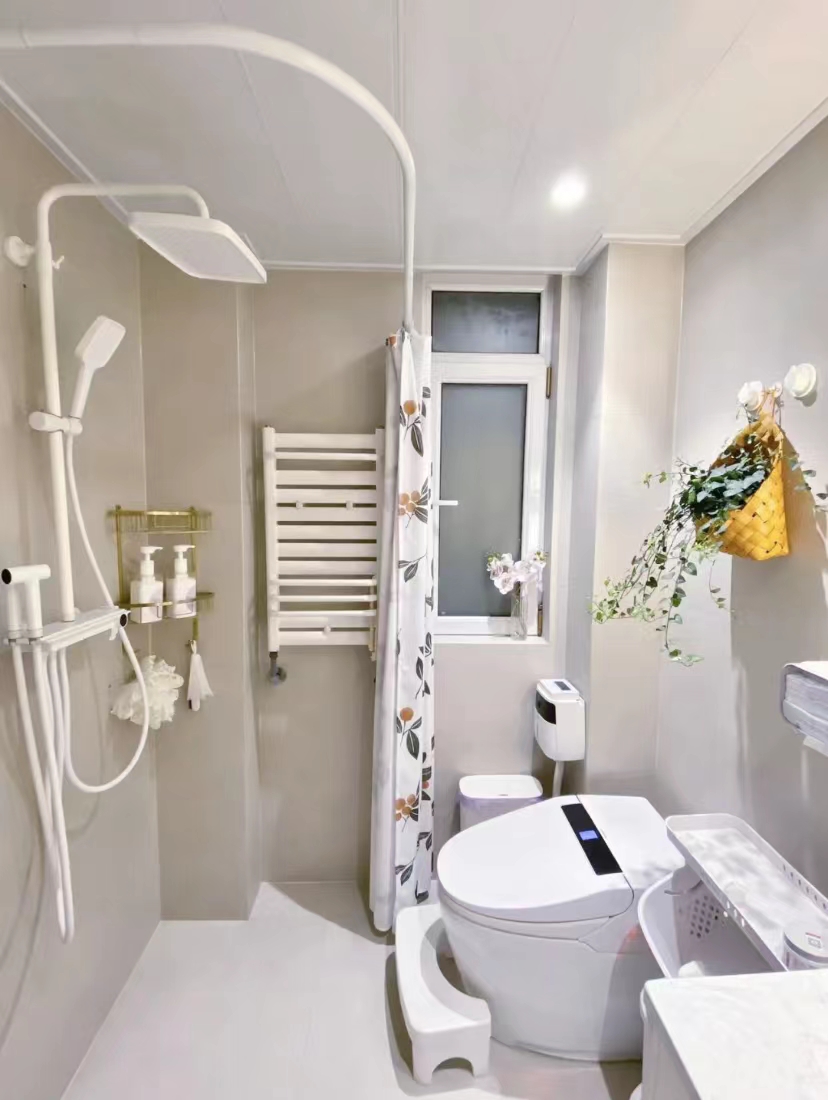 1.8*2米的尺寸比较方正,进门是浴室柜加浴室镜等,选择了白色系,更加简单整洁。左边是智能马桶,中间是洗衣筐,左后用了浴帘做了隔断,营造干湿分离,门后放了清洁工具,都上墙,很隐蔽。