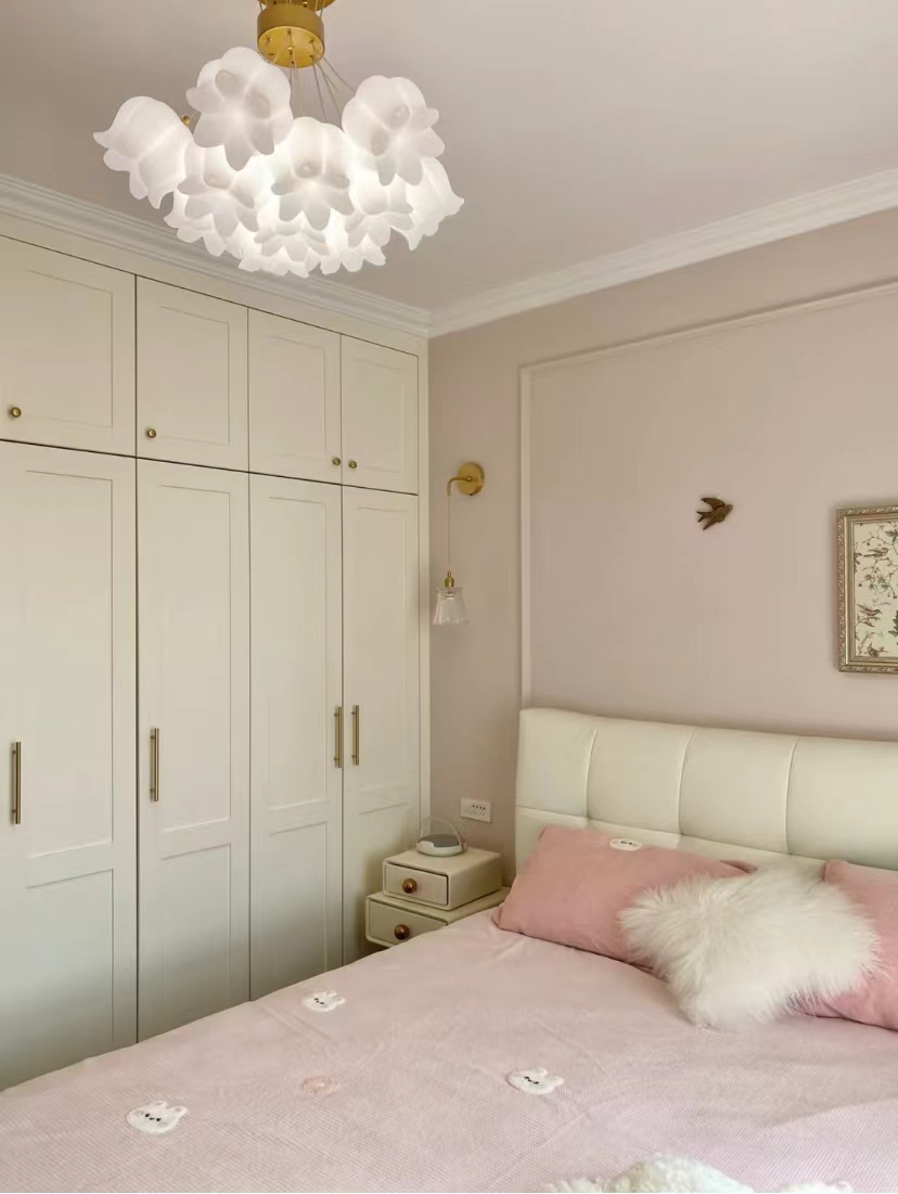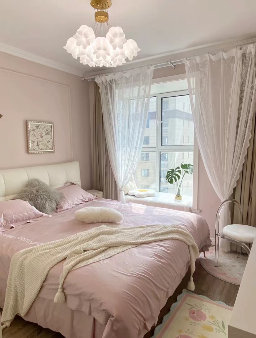 主卧主基调是法式公主风,配上粉色的四件套,更少女了,吊灯选了铃兰灯,很有趣味,像是在童话里一样。床尾放了斗柜,还有小飘窗,都是女主喜欢的。