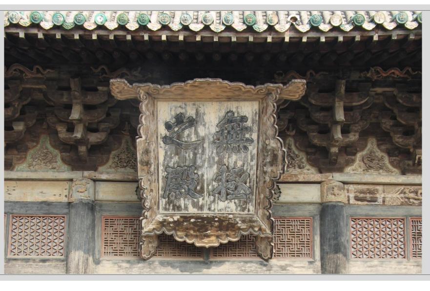 王仲杰:第二座建筑叫做“无极之门”,这个门实际还有一个别名,叫做“龙虎殿”。要从道教的角度来说,青龙白虎就是道教主要神仙的护法神。那么龙虎殿的彩画,因为它比较残破,现在留下的最清楚的就是拱眼壁,刷上灰色,画上有兔子,有些个花卉。我看这几个拱眼壁上灰色的彩画,像是明代或是清代的。除了拱眼壁以外,它的梁、枋、檩上面都断断续续地留有一些彩画,这些彩画已经连不起来了,但是我估计这是元代的原迹。