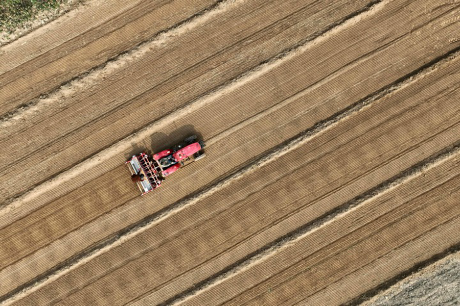 10月14日,邱瑞东驾驶农机在农田里播种冬小麦(无人机照片)。新华社记者 杜一方 摄